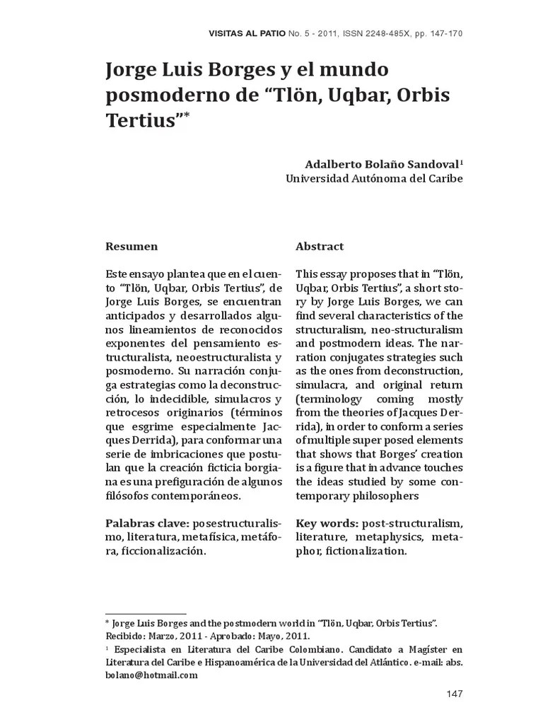 Metanarratives, mirrors and possible worlds in tlön, uqbar, orbis tertius by borges. La presente investigación reconstruye el universo de sentidos presentes en el cuento tlön, uqbar, orbis tertius de jorge luis borges a través . Al análisis literario es la propuesta de una semántica constructiva.