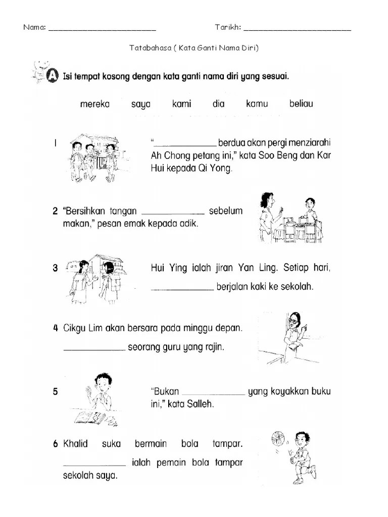 Free download latihan kata ganti nama diri tahun 1⬇️download here 免费分享一年级国语人称代名词练习⬇️请自行下载和收藏. Azman tidak ke sekolah pada hari ini kerana ______ demam . 1 bryan seorang murid yang pintar ____ belajar di kelas 6 jujur. 同学们需要完成ba ms49, ba ms50 & bta ms12, 拍照,上传到gc提交。 selamat belajar. You can do the exercises online or download the worksheet as pdf.